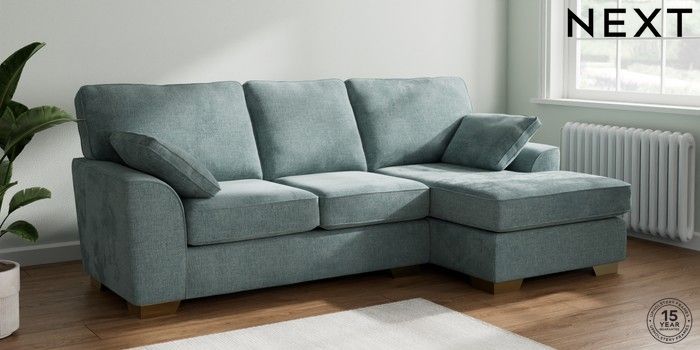 7.2.10 Stamford Medium Sofa Chaise - Right Hand Chunky Chenille Light Teal Green Large Square Angle - Brushed Brass | Made Click here to use our website with more accessibility support, for example screen readers