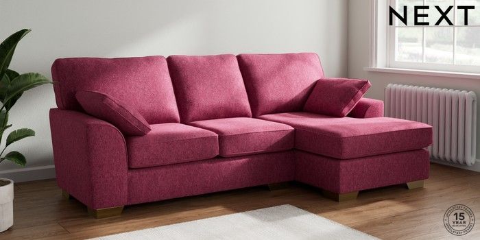 7.2.10 Stamford Medium Sofa Chaise - Right Hand Cotswold Chenille Dark Raspberry Pink Large Square Angle - Brushed Brass | Made Click here to use our website with more accessibility support, for example screen readers