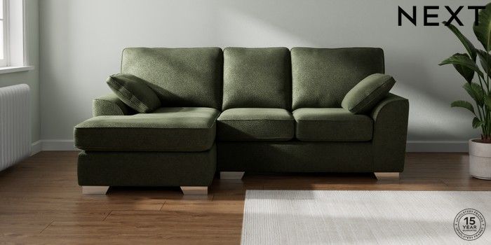7.2.10 Stamford Small Sofa Chaise - Left Hand Boucle Chenille Dark Moss Green Large Square Angle - Chrome Metal | Made Click here to use our website with more accessibility support, for example screen readers