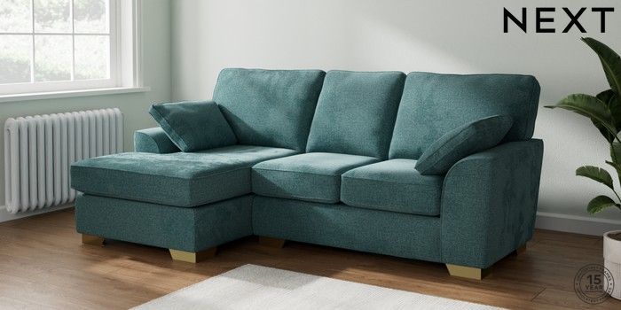 7.2.10 Stamford Small Sofa Chaise - Left Hand Chunky Chenille Mid Teal Green Large Square Angle - Brushed Brass | Made Click here to use our website with more accessibility support, for example screen readers