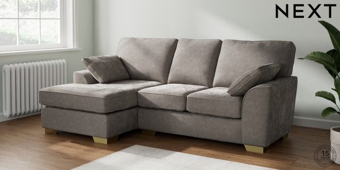 7.2.10 Stamford Small Sofa Chaise - Left Hand Distressed Velour French Grey Large Square Angle - Brushed Brass | Made Click here to use our website with more accessibility support, for example screen readers