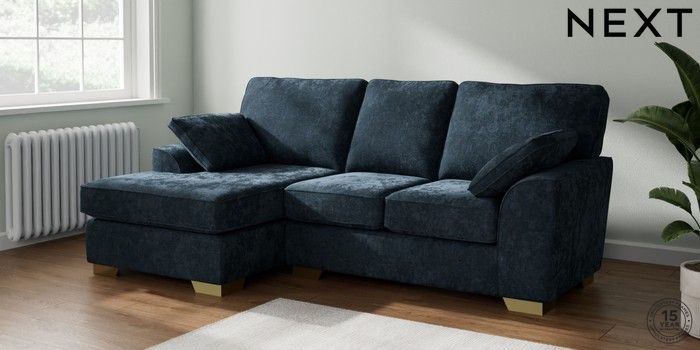 7.2.10 Stamford Small Sofa Chaise - Left Hand Distressed Velour Midnight Blue Large Square Angle - Brushed Brass | Made Click here to use our website with more accessibility support, for example screen readers