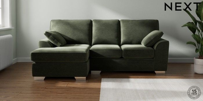 7.2.10 Stamford Small Sofa Chaise - Left Hand Luxe Chenille Mid Green Large Square Angle - Chrome Metal | Made Click here to use our website with more accessibility support, for example screen readers