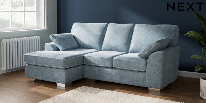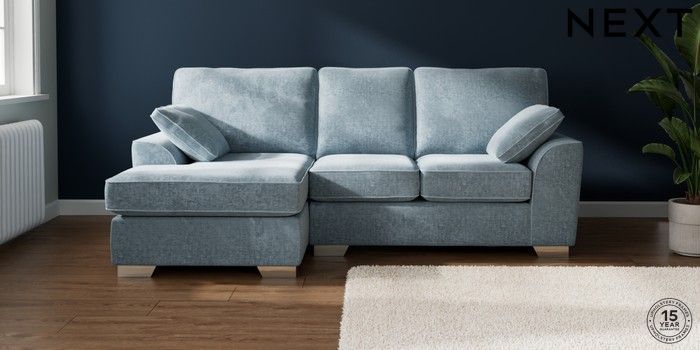 7.2.10 Stamford Small Sofa Chaise - Left Hand Plush Chenille Light Blue Large Square Angle - Chrome Metal | Made Click here to use our website with more accessibility support, for example screen readers