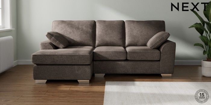 7.2.10 Stamford Small Sofa Chaise - Left Hand Plush Chenille Mink Brown Large Square Angle - Chrome Metal | Made Click here to use our website with more accessibility support, for example screen readers