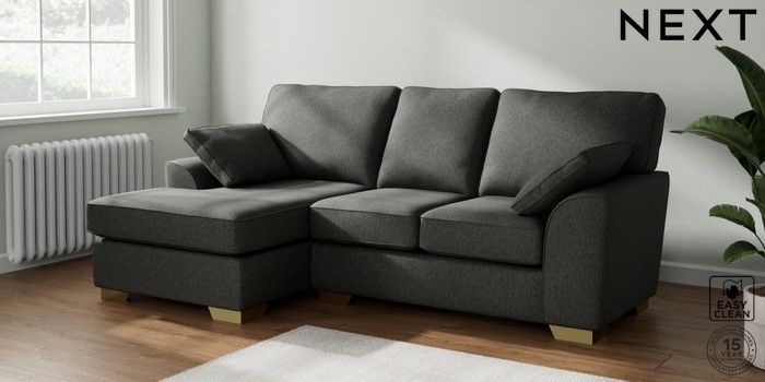 7.2.10 Stamford Small Sofa Chaise - Left Hand Tweedy Blend Easy Clean Charcoal Grey Large Square Angle - Brushed Brass | Made Click here to use our website with more accessibility support, for example screen readers
