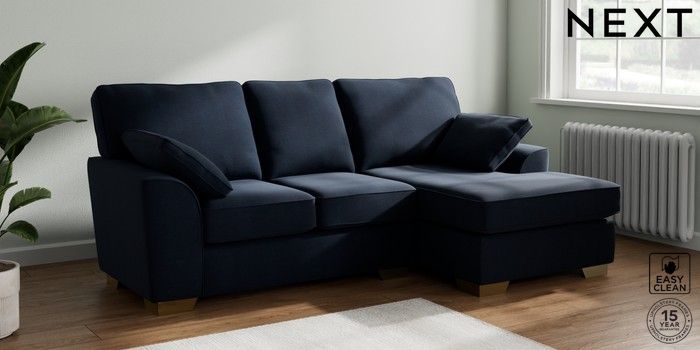 7.2.10 Stamford Small Sofa Chaise - Right Hand Fine Chenille Easy Clean Dark Navy Blue Large Square Angle - Brushed Brass | Made Click here to use our website with more accessibility support, for example screen readers