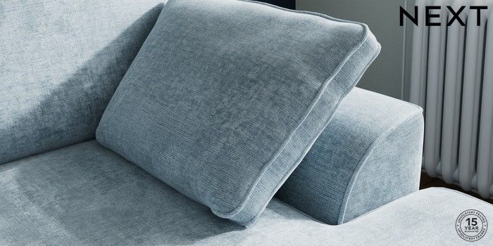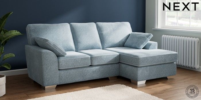 7.2.10 Stamford Small Sofa Chaise - Right Hand Plush Chenille Light Blue Large Square Angle - Chrome Metal | Made Click here to use our website with more accessibility support, for example screen readers