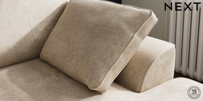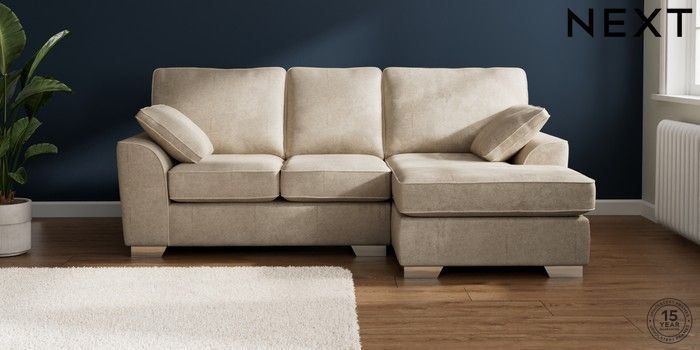 7.2.10 Stamford Small Sofa Chaise - Right Hand Plush Chenille Light Natural Large Square Angle - Chrome Metal | Made Click here to use our website with more accessibility support, for example screen readers