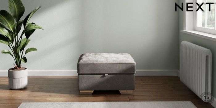7.2.10 Stamford Storage Footstool Distressed Velour French Grey Square Angle - Chrome Metal | Made Click here to use our website with more accessibility support, for example screen readers