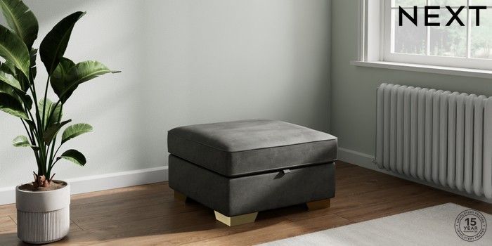 7.2.10 Stamford Storage Footstool Monza Faux Leather Easy Clean Dark Grey Square Angle - Brushed Brass | Made Click here to use our website with more accessibility support, for example screen readers