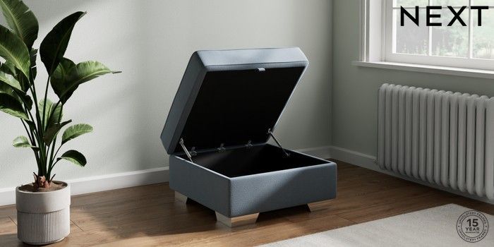 7.2.10 Stamford Storage Footstool Relaxed Linen Look Mid Blue Square Angle - Chrome Metal | Made Click here to use our website with more accessibility support, for example screen readers