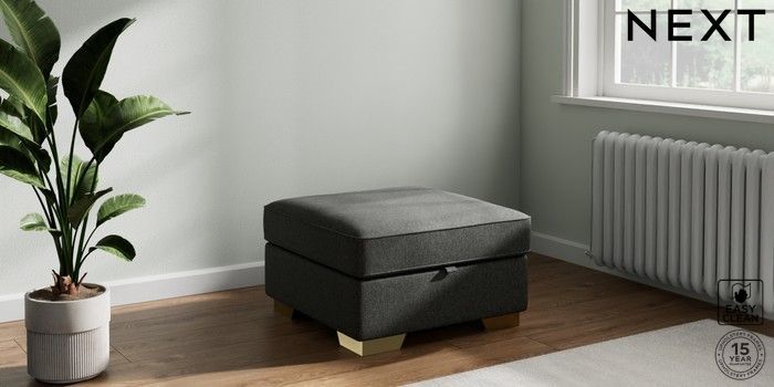 7.2.10 Stamford Storage Footstool Tweedy Blend Easy Clean Charcoal Grey Square Angle - Brushed Brass | Made Click here to use our website with more accessibility support, for example screen readers