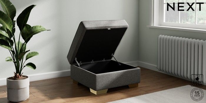 7.2.10 Stamford Storage Footstool Tweedy Blend Easy Clean Dark Grey Square Angle - Brushed Brass | Made Click here to use our website with more accessibility support, for example screen readers