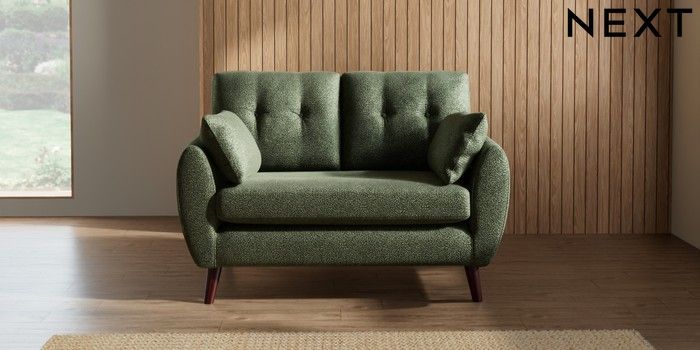 7.2.10 Wilson Buttoned Back 2 Seater Small Sofa Boucle Chenille Dark Moss Green Retro Tapered - Dark Brown | Made Click here to use our website with more accessibility support, for example screen readers