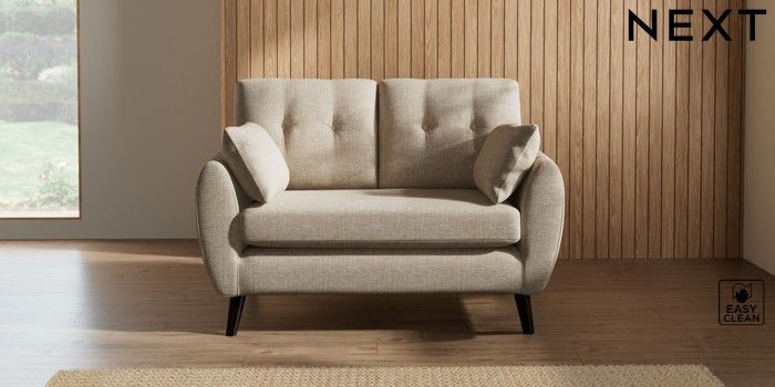 7.2.10 Wilson Buttoned Back 2 Seater Small Sofa Boucle Weave Easy Clean Dark Natural Retro Tapered - Dark | Made Click here to use our website with more accessibility support, for example screen readers