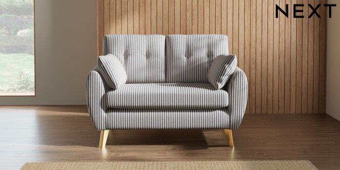 7.2.10 Wilson Buttoned Back 2 Seater Small Sofa Chenille Stripe Slate Blue Metal Tapered - Gold | Made Click here to use our website with more accessibility support, for example screen readers