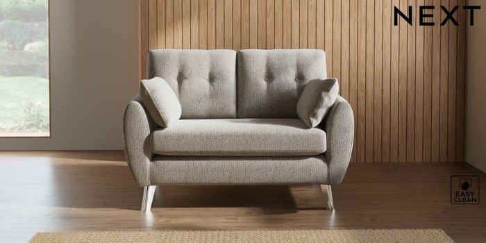 7.2.10 Wilson Buttoned Back 2 Seater Small Sofa Chunky Boucle Easy Clean Dove Metal Tapered - Chrome | Made Click here to use our website with more accessibility support, for example screen readers