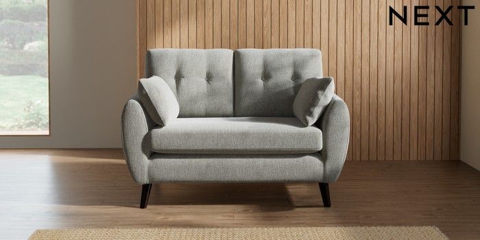 7.2.10 Wilson Buttoned Back 2 Seater Small Sofa Chunky Chenille Light Grey Retro Tapered - Dark | Made Click here to use our website with more accessibility support, for example screen readers