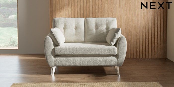 7.2.10 Wilson Buttoned Back 2 Seater Small Sofa Chunky Texture Oyster Metal Tapered - Chrome | Made Click here to use our website with more accessibility support, for example screen readers
