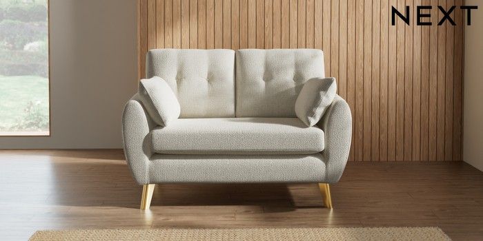 7.2.10 Wilson Buttoned Back 2 Seater Small Sofa Chunky Texture Oyster Metal Tapered - Gold | Made Click here to use our website with more accessibility support, for example screen readers