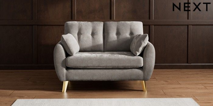 7.2.10 Wilson Buttoned Back 2 Seater Small Sofa Distressed Velour French Grey Metal Tapered - Gold | Made Click here to use our website with more accessibility support, for example screen readers