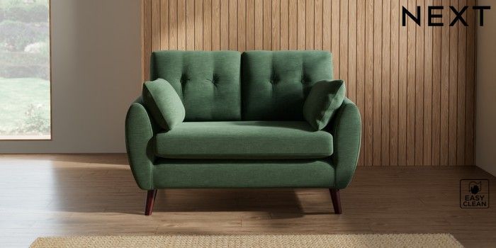 7.2.10 Wilson Buttoned Back 2 Seater Small Sofa Fine Chenille Easy Clean Mid Khaki Green Retro Tapered - Dark Brown | Made Click here to use our website with more accessibility support, for example screen readers