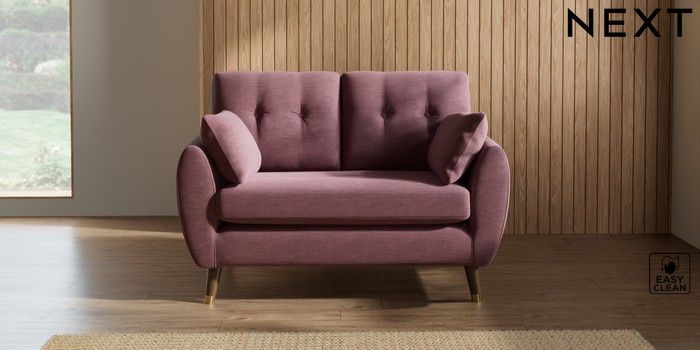 7.2.10 Wilson Buttoned Back 2 Seater Small Sofa Fine Chenille Easy Clean Mid Mulberry Purple Low Retro Tapered Metal Cap - Mid | Made Click here to use our website with more accessibility support, for example screen readers
