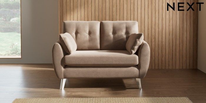 7.2.10 Wilson Buttoned Back 2 Seater Small Sofa Luxe Chenille Mid Natural Metal Tapered - Chrome | Made Click here to use our website with more accessibility support, for example screen readers