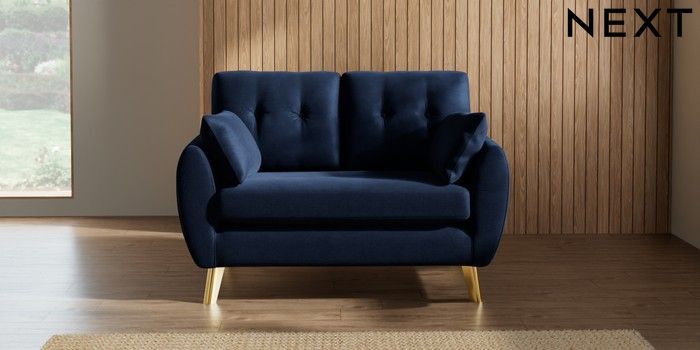 7.2.10 Wilson Buttoned Back 2 Seater Small Sofa Luxe Chenille Navy Blue Metal Tapered - Gold | Made Click here to use our website with more accessibility support, for example screen readers