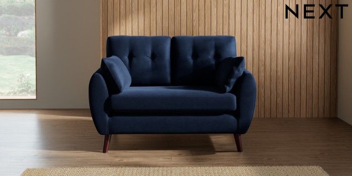 7.2.10 Wilson Buttoned Back 2 Seater Small Sofa Luxe Chenille Navy Blue Retro Tapered - Dark Brown | Made Click here to use our website with more accessibility support, for example screen readers