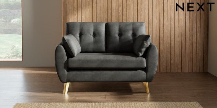 7.2.10 Wilson Buttoned Back 2 Seater Small Sofa Monza Faux Leather Easy Clean Dark Grey Metal Tapered - Gold | Made Click here to use our website with more accessibility support, for example screen readers