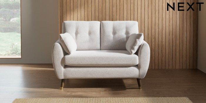 7.2.10 Wilson Buttoned Back 2 Seater Small Sofa Multi Weave Oyster Low Retro Tapered Metal Cap - Mid | Made Click here to use our website with more accessibility support, for example screen readers