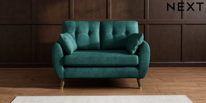 7.2.10 Wilson Buttoned Back 2 Seater Small Sofa Plush Chenille Dark Teal Green Low Retro Tapered Metal Cap - Mid | Made Click here to use our website with more accessibility support, for example screen readers