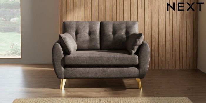 7.2.10 Wilson Buttoned Back 2 Seater Small Sofa Plush Chenille Mink Brown Metal Tapered - Gold | Made Click here to use our website with more accessibility support, for example screen readers