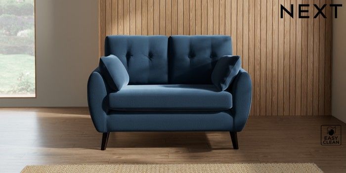 7.2.10 Wilson Buttoned Back 2 Seater Small Sofa Plush Velvet Easy Clean Airforce Blue Retro Tapered - Dark | Made Click here to use our website with more accessibility support, for example screen readers
