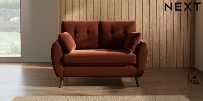 7.2.10 Wilson Buttoned Back 2 Seater Small Sofa Plush Velvet Easy Clean Ginger Orange Retro Tapered - Mid | Made Click here to use our website with more accessibility support, for example screen readers