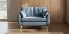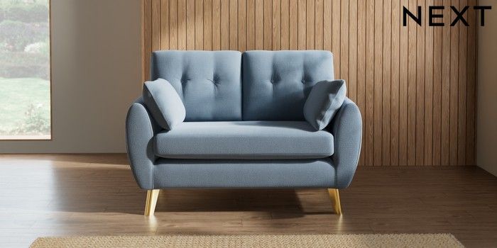 7.2.10 Wilson Buttoned Back 2 Seater Small Sofa Relaxed Linen Look Mid Blue Metal Tapered - Gold | Made Click here to use our website with more accessibility support, for example screen readers