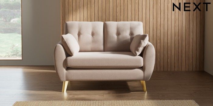 7.2.10 Wilson Buttoned Back 2 Seater Small Sofa Relaxed Linen Look Mid Natural Metal Tapered - Gold | Made Click here to use our website with more accessibility support, for example screen readers