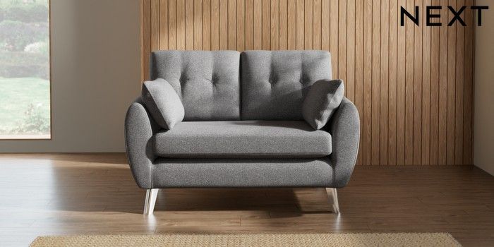 7.2.10 Wilson Buttoned Back 2 Seater Small Sofa Studio Chenille Mid Grey Metal Tapered - Chrome | Made Click here to use our website with more accessibility support, for example screen readers