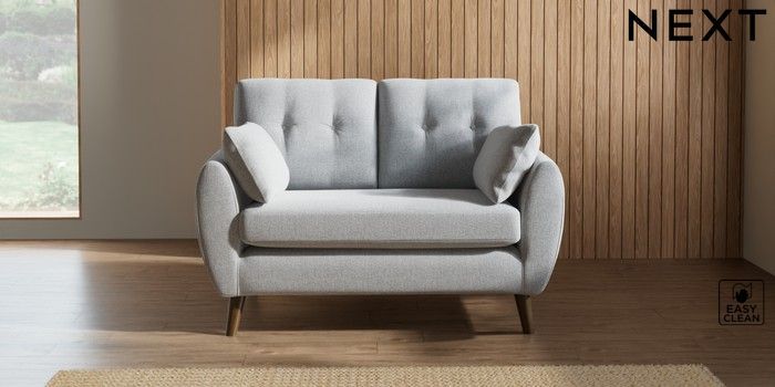 7.2.10 Wilson Buttoned Back 2 Seater Small Sofa Tweedy Blend Easy Clean Light Silver Grey Retro Tapered - Mid | Made Click here to use our website with more accessibility support, for example screen readers