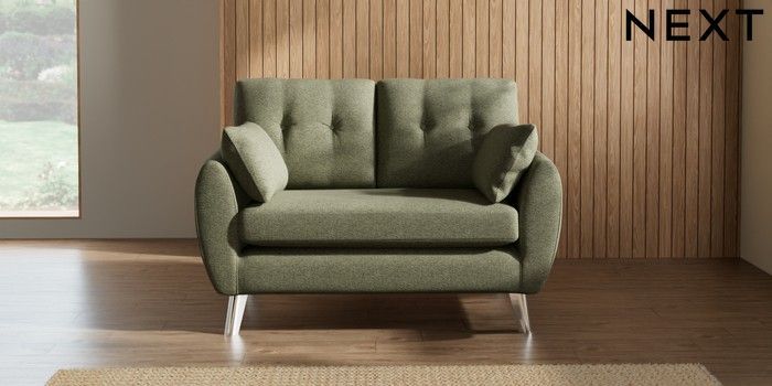 7.2.10 Wilson Buttoned Back 2 Seater Small Sofa Tweedy Chenille Mid Moss Green Metal Tapered - Chrome | Made Click here to use our website with more accessibility support, for example screen readers