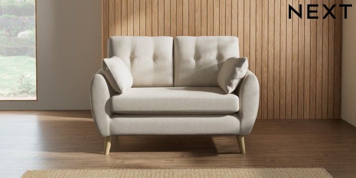 7.2.10 Wilson Buttoned Back 2 Seater Small Sofa Tweedy Chenille Oyster Retro Tapered - Light | Made Click here to use our website with more accessibility support, for example screen readers