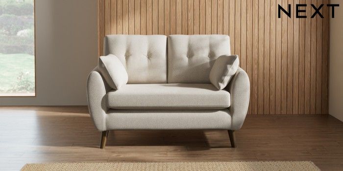 7.2.10 Wilson Buttoned Back 2 Seater Small Sofa Tweedy Chenille Oyster Retro Tapered - Mid | Made Click here to use our website with more accessibility support, for example screen readers