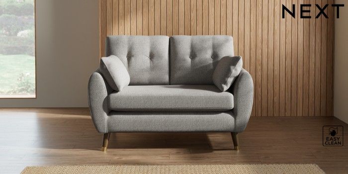 7.2.10 Wilson Buttoned Back 2 Seater Small Sofa Woven Chenille Easy Clean Light Grey Low Retro Tapered Metal Cap - Mid | Made Click here to use our website with more accessibility support, for example screen readers