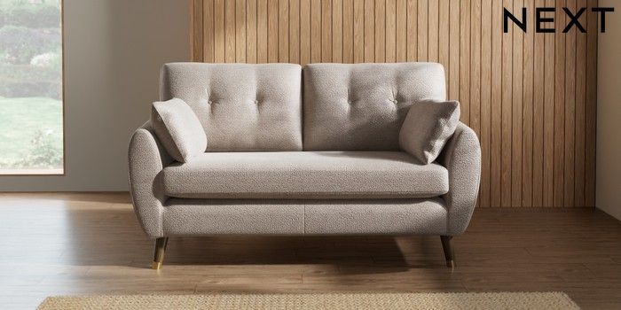 7.2.10 Wilson Buttoned Back 2 Seater Sofa Boucle Chenille Light Natural Low Retro Tapered Metal Cap - Mid | Made Click here to use our website with more accessibility support, for example screen readers