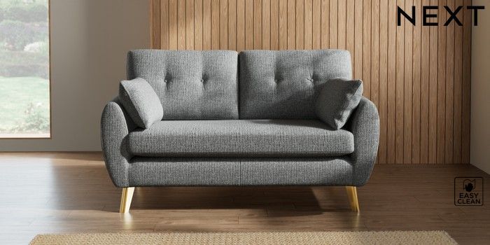 7.2.10 Wilson Buttoned Back 2 Seater Sofa Chunky Boucle Easy Clean Mid Grey Metal Tapered - Gold | Made Click here to use our website with more accessibility support, for example screen readers