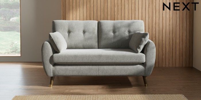 7.2.10 Wilson Buttoned Back 2 Seater Sofa Chunky Chenille Light Grey Low Retro Tapered Metal Cap - Mid | Made Click here to use our website with more accessibility support, for example screen readers