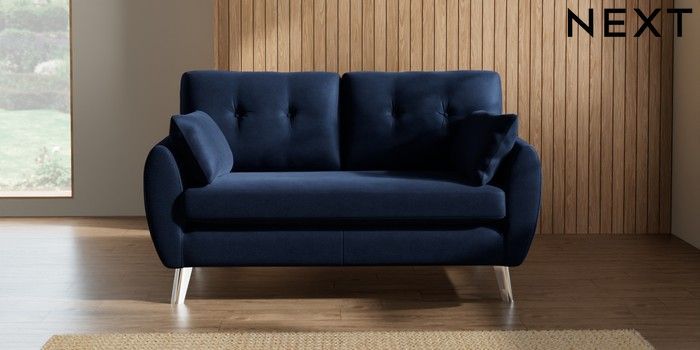 7.2.10 Wilson Buttoned Back 2 Seater Sofa Luxe Chenille Navy Blue Metal Tapered - Chrome | Made Click here to use our website with more accessibility support, for example screen readers
