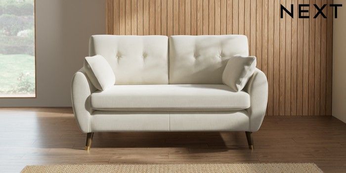 7.2.10 Wilson Buttoned Back 2 Seater Sofa Luxe Chenille Oyster Low Retro Tapered Metal Cap - Mid | Made Click here to use our website with more accessibility support, for example screen readers